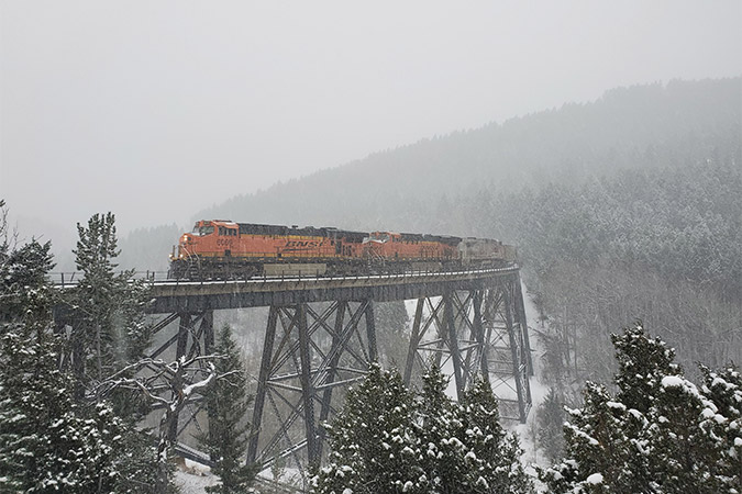 "My friends and I wanted to make a trip out west to Montana. We had planned to make the trip in October to see the western larch and aspen turn yellow. Instead we were greeted with cold temperatures and nearly a foot of snow falling the same day we arrived! We made our way to Helena to photograph the gorgeous territory of Mullan Pass. This former Northern Pacific trackage is now operated by Montana Rail Link. My friends and I headed up the pass to try and get some trains rolling through the snow. Already there was one to two feet of snow on the ground. With frequent and heavy flurries the scene only got more magical. We saw several trains grind their way up the grade, heading west in heavy snow. The snowfall began to slow just as we heard a train coming east begin its descent over the continental divide, which you can see in the background. I ran up the hill through the deep snow and made it here just as the lead locomotive began to traverse the trestle. Huffing and puffing, I quickly lifted my camera up and snapped this picture of BNSF 6778 leading an autorack train eastbound down the pass, crossing Skyline Trestle on October 18, 2020. The bright orange locomotive pops amid the heavy grey clouds and the snow-covered hills. Nothing screams winter railroading quite like mountains, snow, Montana, and BNSF Railway."