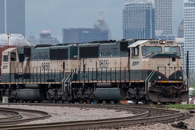 This cream and green paint scheme is featured on a small number of locomotives. It’s named after Gerald Grinstein, former CEO of BNSF predecessor Burlington Northern, and is sometimes referred to informally as “Grinstein Green.” One of the remaining locomotives featuring this unique paint scheme is numbered 9535 and now features a BNSF logo.