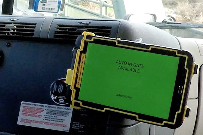 Once on property, the truck’s GPS triggers a second geofence announcing its arrival. The truck drives over a ground sensor that identifies its unique vehicle magnetic signature. BNSF then guides the truck through the facility using this unique identifier, raising the in-gate and providing the drop-off and pickup directions through the driver’s ELD.