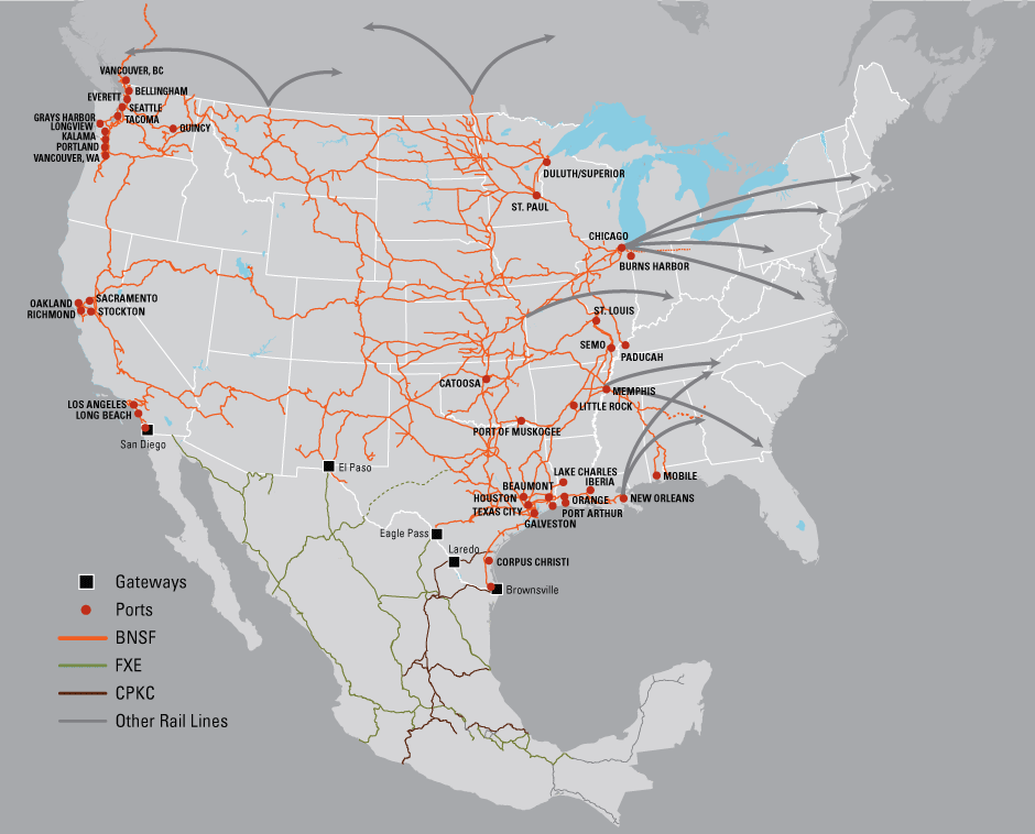 BNSF Mexico is here to facilitate your Mexico transborder shipping with five key United States Gateways: San Diego, El Paso, Eagle Pass, Laredo and Brownsville. Through connections with CSX, Norfolk Southern (NS), Canadian National (CN), Canadian Pacific Kansas City (CPKC), Ferrocarril Mexicano (FXE) and KCS Mexico (KCSM), BNSF offers access to all of the major North American markets. BNSF also gives you access to key West and Gulf coast ports. Tap into our expertise on secure border-crossing shipping and all issues concerning cross-border freight.